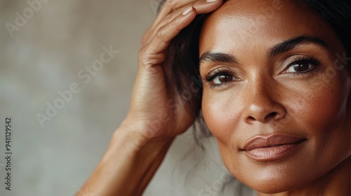 woman, confident, flawless, skin, posing, casual attire, portrait, female, graceful, skincare, authentic, natural, glow, radiant, closeup, mature, adult, lifestyle, strength, individuality, fashion, feminine, attractive, stylish, diverse, ethnic, multicultural, vibrant, positive, empowerment, aesthetic, human, person, minimalism, natural makeup