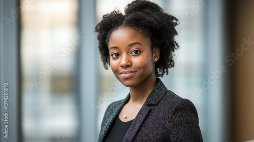 Confident young Afro businesswoman in professional attire, embodying success and leadership in the corporate world.
