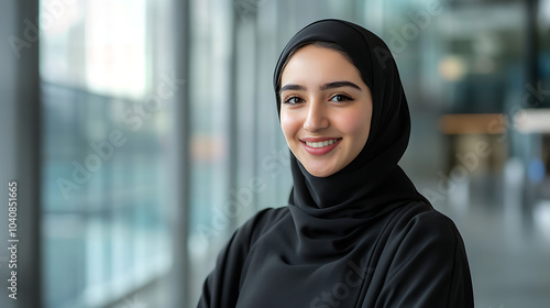 Confident young Arab woman entrepreneur in modern office hall, smiling cheerfully in natural lighting