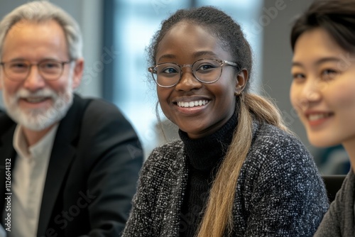 business, meeting, conference, woman, young, black, african, confident, smiling, happy, professional, goggles, office, workplace, teamwork, colleague, diverse, multiracial, collaboration, team, group, portrait, head shot, indoor, modern, stylish, leadership, success, corporate, career