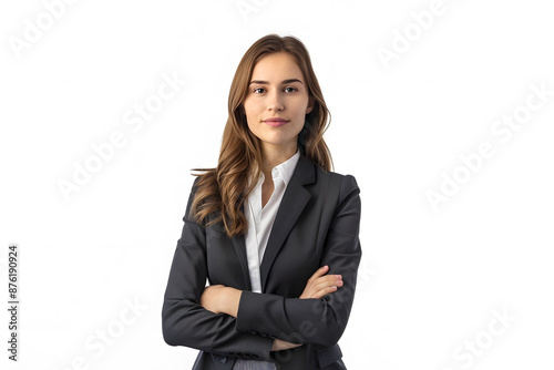 Confident young businesswoman in formal attire with arms crossed, looking at the camera against a white background.