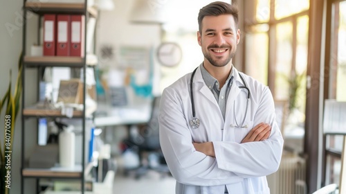 eastern, european, doctor, medicals, office, young, male, health care, professional, physician, portrait, confident, smiling, modern, practice, laboratory, coat, stethoscope, trust, competence, medicine, hospital, clinic, wellness, treatment, care, health, workplace, interior, light, shelf, folder, instrument, consultation, environment, patient, friendly, expertise, workspace, facility, ambient, room, background, occupation, approachable