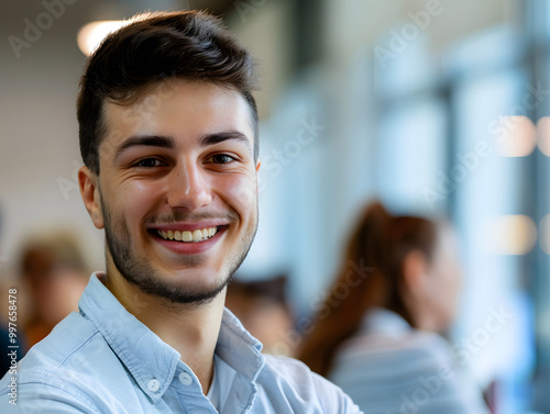 Confident young man smiling in professional setting, showcasing positive attitude and engagement. His friendly demeanor adds warmth to atmosphere