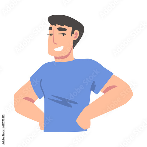 Confident Young Man Standing with Hands on his Hips, Guy Expressing Positive Emotions, Self Love, Self Pride, Acceptance, Esteem Cartoon Vector Illustration