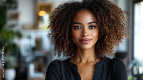woman, young, female, portrait, confident, successful, professional, business, entrepreneur, smile, happy, beautiful, curly hair, afro, natural beauty, black woman, african american, diversity, inclusion, empowerment, office, workplace, casual attire, stylish, fashion, blacktop, earring, head shot, closeup, sharpened, modern, contemporary, businesswoman, boss, leader, positive, energy, motivation
