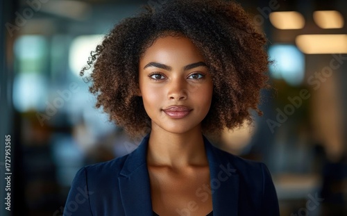 Confident young woman with natural curly hair and smooth skin wearing a dark blazer looking directly at the camera with a calm and poised expression indoors