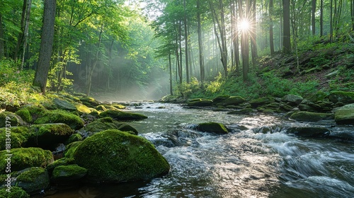 confluence. Two forest streams merging into a single river, blending water currents, mossy rocks, dappled sunlight through trees. ESG reports.