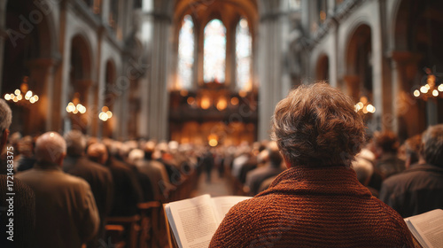 Congregation gathered inside a grand cathedral for worship, viewed from behind an elderly person holding a hymnal, under warm lighting and stained glass. Selective focus.
