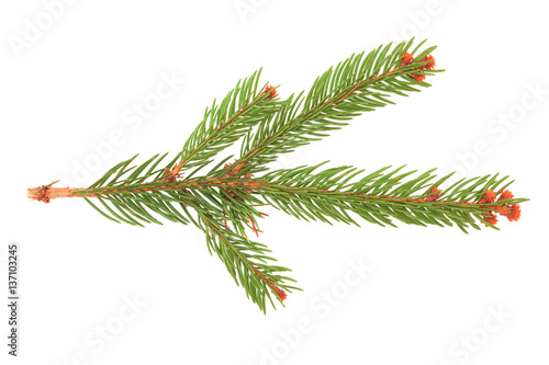 Coniferous branch. Isolated on white background. Green twig on white background. Coniferous twig, graphic template. Coniferous branch, graphic element. Branch on white background.