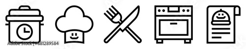 Conjunto de iconos de cocina. Preparación de alimentos. Cacerola con reloj, sombrero de chef, tenedor con cuchillo, horno, receta. Ilustración vectorial