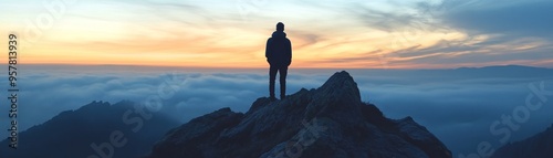 Conquer The Day: Person Standing on Mountaintop at Dawn Ready to Face New Challenges
