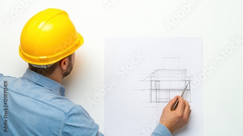 Construction blueprint design, architect in hard hat drawing detailed house plan