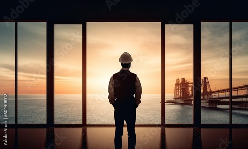 Construction concept. at back of the construction worker head which is wearing the safety helmet and checking work at the construction site. Non-existent person. Generative Ai