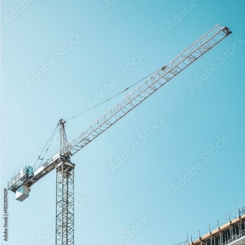 crane, construction, building, sky, blue, machine, industry, work, site, tower, height, metal, steel, lift, heavy, equipment, engineering, project, development, progress, architecture, urban, city, infrastructure, technology, power, strength, hoist, boom, cable, wire, load, transport, elevated, structure, high, industrial, modern, exterior, daytime, sunlight, clear, up high, view, up, angle, perspective, background, design
