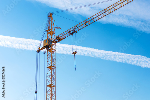 crane, construction, building, sky, industry, tower, blue, equipment, engineering, development, steel, build, site, architecture, high, tall, business, lift, structure, lifting, activity, industrial, work, urban, machine