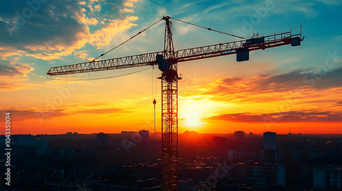 Construction Crane Silhouette Against a Vibrant Sunset Sky