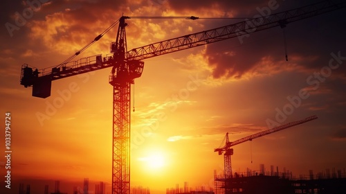Construction Cranes Silhouette Against Sunset Sky