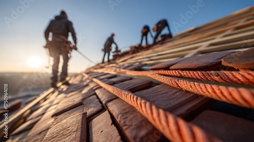 Construction Crew on Rooftop: A team of construction workers meticulously lay tile on the roof, expertly navigating the heights with focus and precision, bathed in the golden hues of the setting sun.