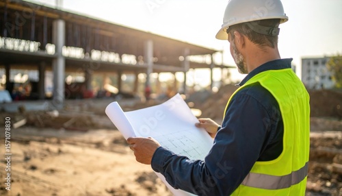 construction, engineer, architect, blueprint, plan, site, building, professional, man, men at work, safety, vest, hard, hat, reviewing, document, sunlight, light, view, foreman, design, detail, sharpened, concentrating, foresight, project, progress, review, analysis, development, industrial, infrastructure