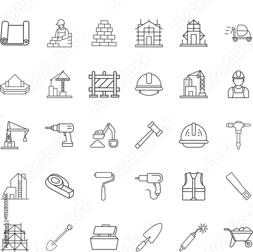 construction, icon, tool, equipment, building, men at work, helmet, safety, material, brick, scaffolding, crane, hammer, drill, cement, mixer, paint, roller, tape, trowel, shovel, jackhammer, hard hat, vest, plan, blueprint, architecture, engineer, contractor, site, project, industry, development, house, apartment, skyscraper, infrastructure, work, job, labor, manual, machinery, technology, process, design, drawing, construction worker, building material