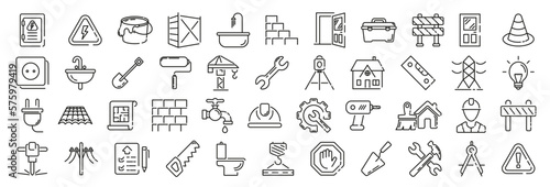 construction, icon, set, linear, symbol, building, brick, wall, hammer, key, hook, privies, men at work, work, home, house, electric, hamlet, gear, drill, mains outlet, level, crane, roller, wrench, bathtub, door, tool, paint, bucket