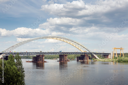 Construction of a new arch bridge across the Dnipro (Dnieper) River, Kyiv, Ukraine. Large infrastructure facility on the water