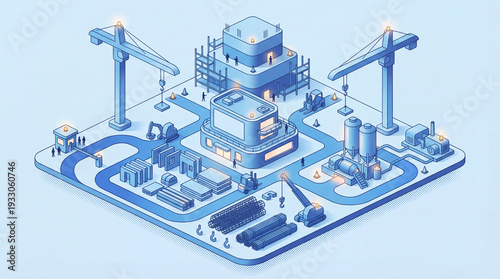 Construction Site Operations Ecosystem with Cranes and Modules, Isometric Project Campus with Logistics Routes, Safety Nodes and Work Zones.