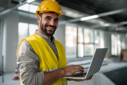construction, men at work, safety equipment, helmet, vest, laptop, building site, indoor, industrial, engineering, professional, technology, industry, teamwork, architecture, workwear, blue-collar, business, construction worker, civil engineering, modern building, corporate, autonomous, collaboration, facility, team