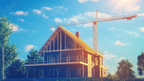 construction, house, crane, sky, building, architecture, development, property, home, site, under, new, progress, real, estate, investment, urban, landscape, residential, structure, exterior, design, beam, framework, equipment, arm, tower, work, modern, brick, wooden, roof, window, balcony, landscaping, sun, sunlight, sunbeam, cloudy, blue, tree, green, sunny, bright, day, warm, colours