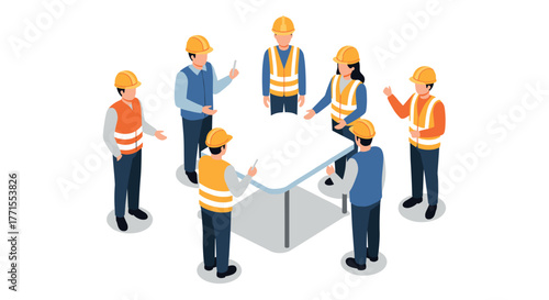 isometric, construction, meeting, safety, gear, teamwork, hard hat, table, collaboration, planning, men at work, project, discussion, architecture, uniform, management, development, site, industry, professional, brainstorming, communication, vest, coordination, engineering, leadership, group, strategy, occupational, infrastructure, workplace, cooperation
