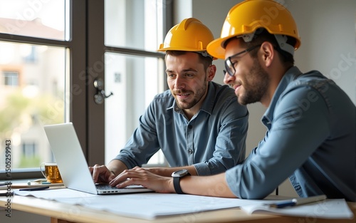 Construction worker and home owner using laptop while analyzing blueprints. High quality