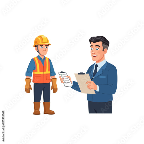 Construction Worker and Supervisor Discussing Project Checklist