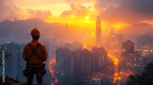 Construction Worker Gazing at City Skyline at Sunset