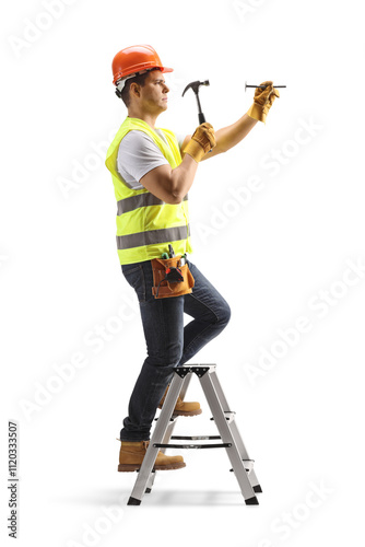 adult, background, belt, builder, construction, contractor, engineer, fasten, hammer, hammering, handyman, happy, hard hat, hat, helmet, hold, industry, isolated, job, ladder, male, man, nail, occupation, people, person, positive, profession, protective, repairman, studio, success, successful, surface, tool, wall, white, work, men at work, young