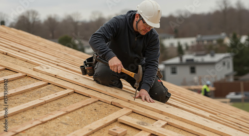 men at work, construction, hammering, building, roofing, carpenter's shop, labor, autumn, tool, craftsmanship, male, outdoors, residential, house, neighbourhood, manual, skilled, renovation, hard hat, wood, nail, beam, maintenance, site, blueprint, teamwork, flooring, energy, structure, industry, repair, improvement, effort, manual labor, service, hammer, focused, detail, construction site, project, construction worker, profession, career, dedication