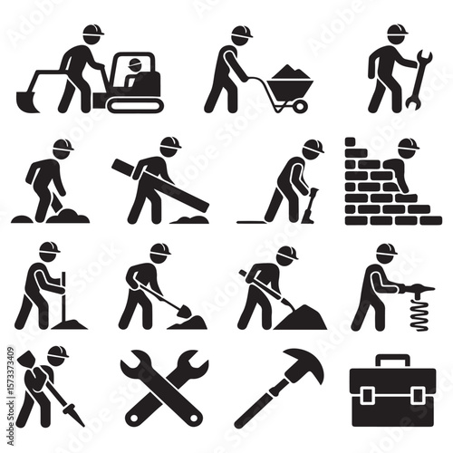 construction, men at work, icon, building, digging, shoveling, wheelbarrow, wrench, shovel, bricklaying, jackhammer, hammer, tool, equipment, industry, labor, manual labor, job, profession, civil engineering, architecture, contractor, hard hat, manual, pictogram, silhouette, set, collection, activity, construction site, builder