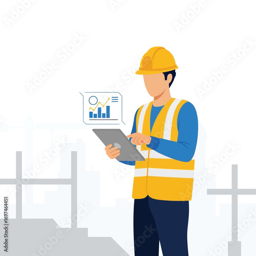 men at work, construction, site, safety, helmet, vest, yellow, industry, engineer, uniform, digital, tablet, technology, datum, analysis, graph, chart, plan, building, architecture, structure, progress, report, monitoring, management, control, development, project, occupation, professional, job, male, person, man, adult, illustration, vector, design, modern, flat, isolated, background, white, grey, blue, scaffolding, support, framework, concrete