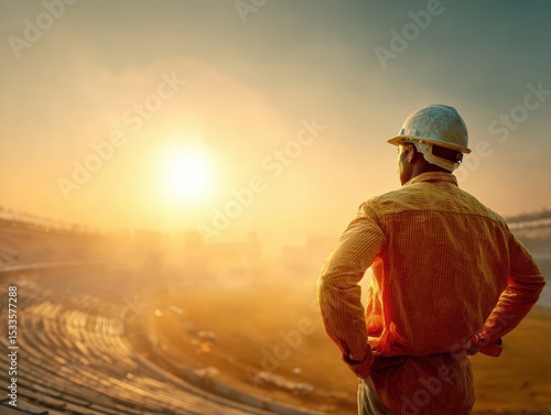 Construction Worker in Helmet Overlooking Stadium Development at Sunset Progress and Safety in Sports Infrastructure Building with Warm Golden Light