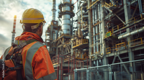Construction worker in safety gear inspecting an industrial plant's complex structure under a cloudy sky.