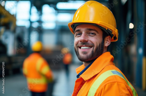 Construction worker in safety gear smiles confidently on job site. Pro builder in orange workwear, yellow safety helmet. Adult male worker at construction project. Man focused on work. Close up