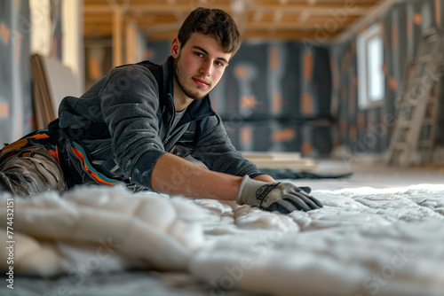 Construction Worker Installing Flooring in Building