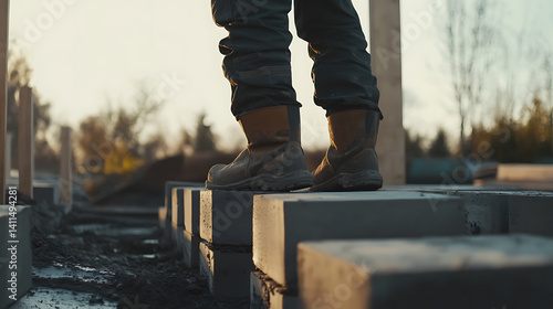 Construction worker laying concrete blocks for a foundation. Featuring masonry and structural integrity