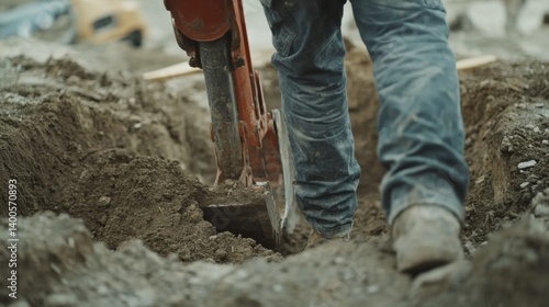 Construction worker operating a backhoe to dig trenches. Featuring power and precision
