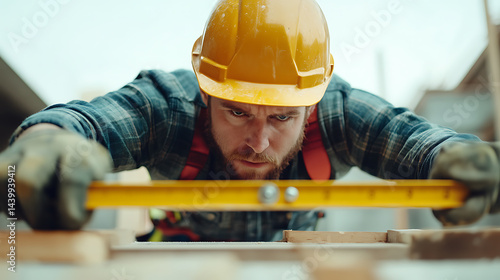 construction worker, hard hat, glove, beard, concentration, tool, measurement, accuracy, building, industrial, safety-gear
