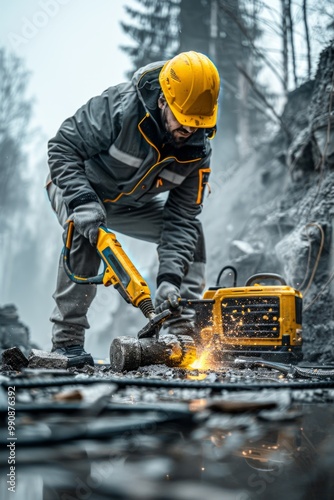 construction, men at work, spark, forest, overcast, morning, labor, industry, craftsmanship, tool, fog, equipment, precision, machinery, outdoors, site, maintenance, repair, foggy, heavy machinery, hard hat, forestry, trade, shopkeeper, skill, professional, workshop, metalworking, mechanical, environment
