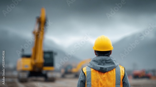Construction Worker Wearing Safety Helmet and Vest Overseeing Heavy Machinery Operation in Industrial Site Amidst Dramatic Cloudy Sky