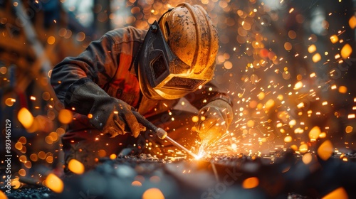 construction, men at work, welding torch, spark, craftsmanship, construction site, metalwork, industrial, safety-gear, construction industry, precision