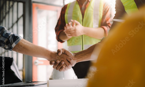 Construction workers, architects and engineers shake hands while working for teamwork and cooperation after completing an agreement in an office facility, successful cooperation concept.