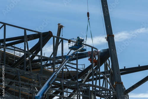 construction, men at work, crane, metal, framework, blue skies, industrial, building, architecture, structure, engineering, steel, site, labor, teamwork, machinery, development, project, urban, industry, equipment, scaffolding, safety, daytime, outdoors, progress, technology, modern, infrastructure, sky