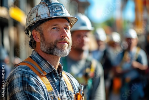 Construction workers preparing for the day at a job site under sunny skies in the early morning